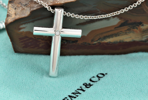 Tiffany & Co. Silver Diamond Large Cross Pendant Necklace