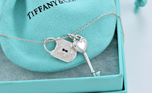 Tiffany & Co. Silver Diamond Heart Key & Hammered Keyhole Padlock Necklace