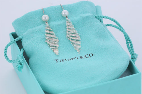 Tiffany & Co. Elsa Peretti Silver Small Mesh Dangle Pearl Earrings