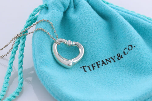 Tiffany & Co. Elsa Peretti Silver Small Open Heart 2 Diamond Charm Necklace
