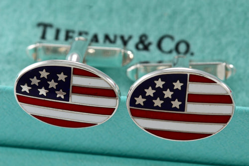 Tiffany & Co. Mens Silver American Flag Enamel Oval Cufflinks