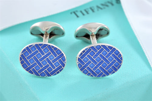 Tiffany & Co. Mens Silver Blue Enamel Plaid England Oval Cufflinks