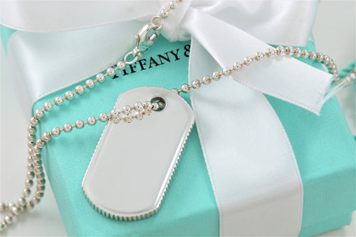 Tiffany & Co. Mens Silver Coin Edge Pendant Dog Tag Beaded Chain Necklace