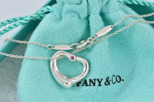 Tiffany & Co. Elsa Peretti Silver Pink Sapphire Small Open Heart Necklace