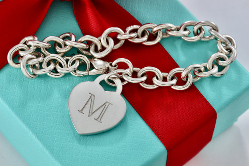 Tiffany & Co. Silver Alphabet Letter "M" Heart Charm 8mm Link 7.5" Bracelet