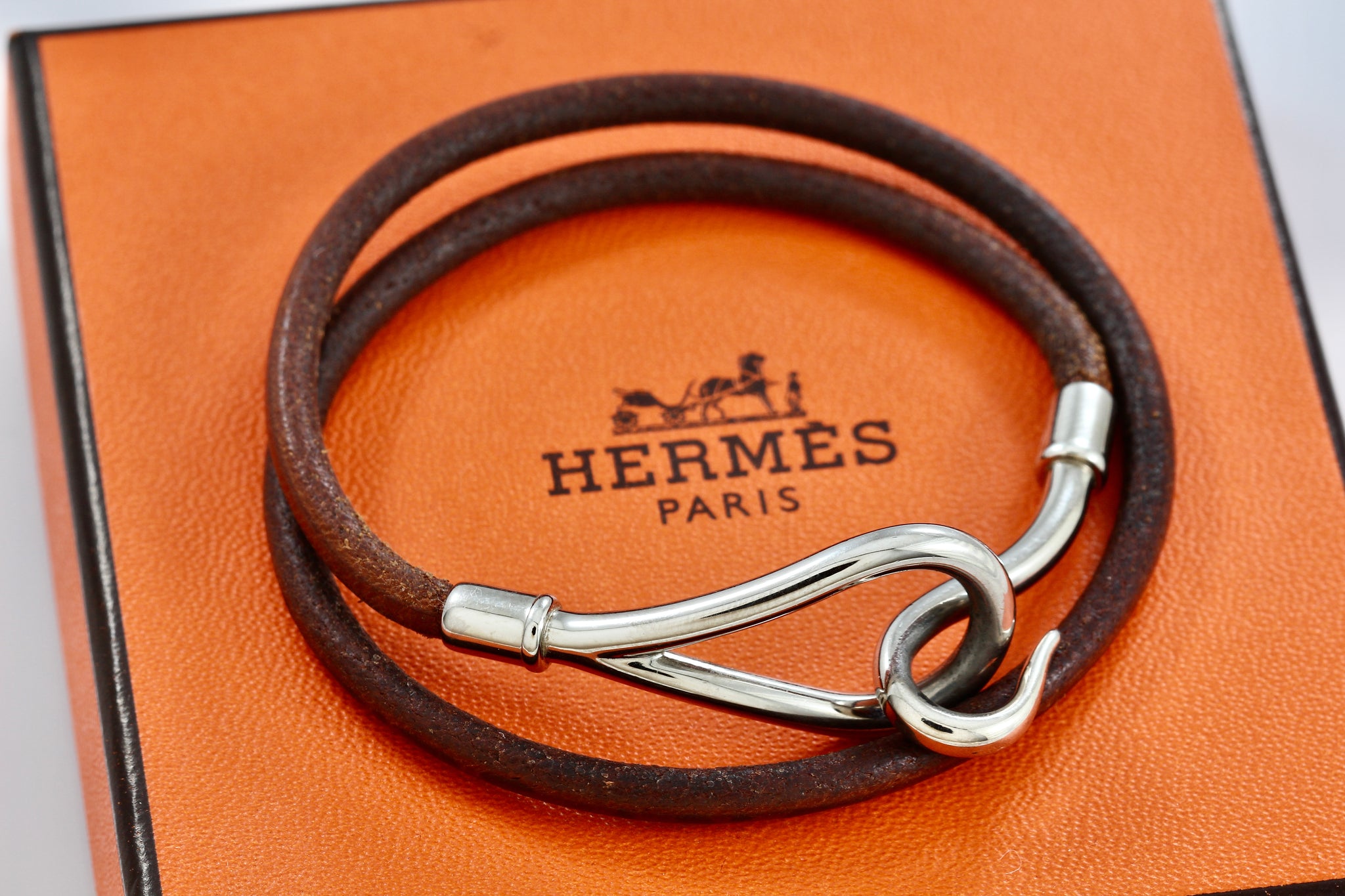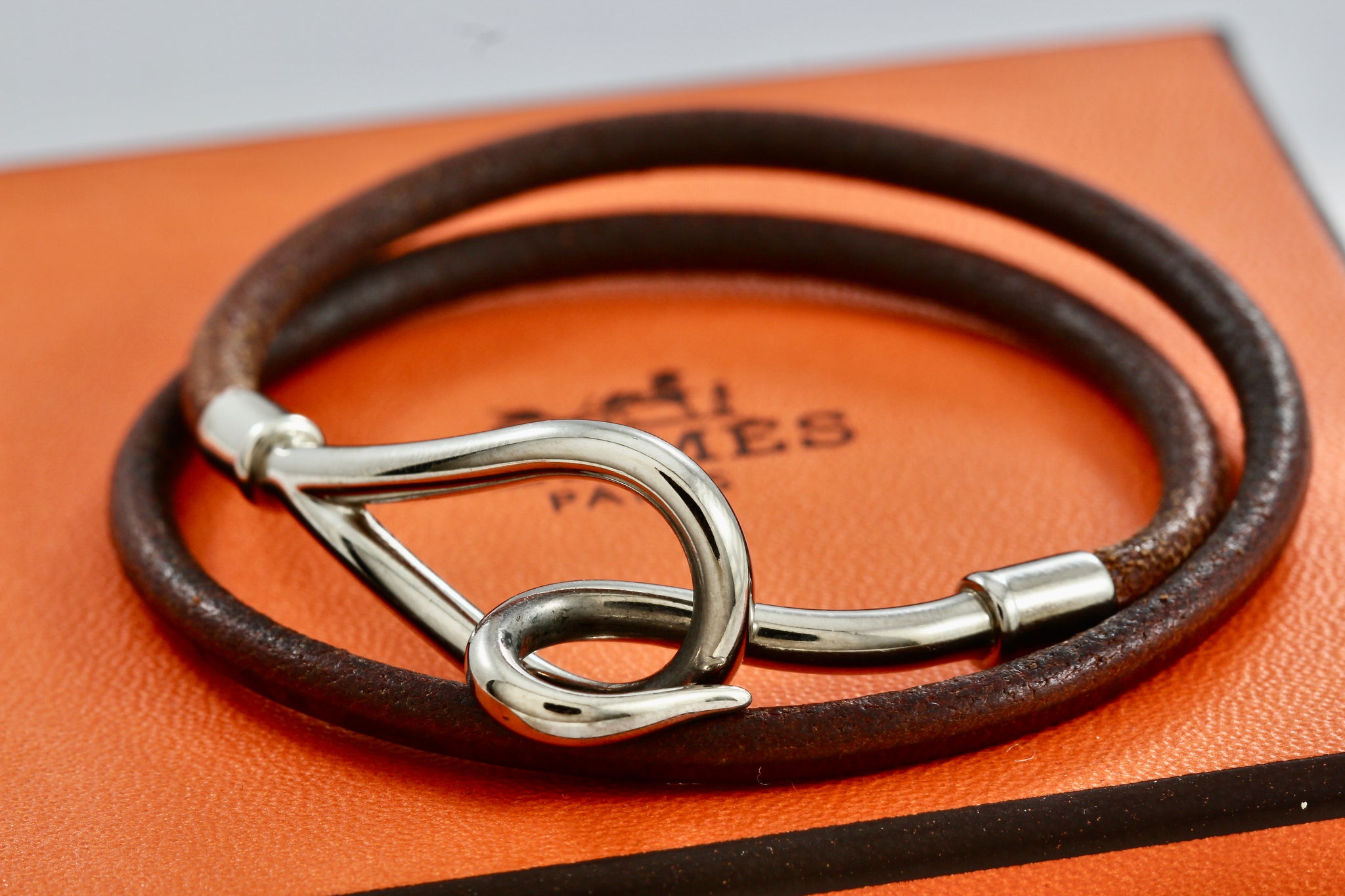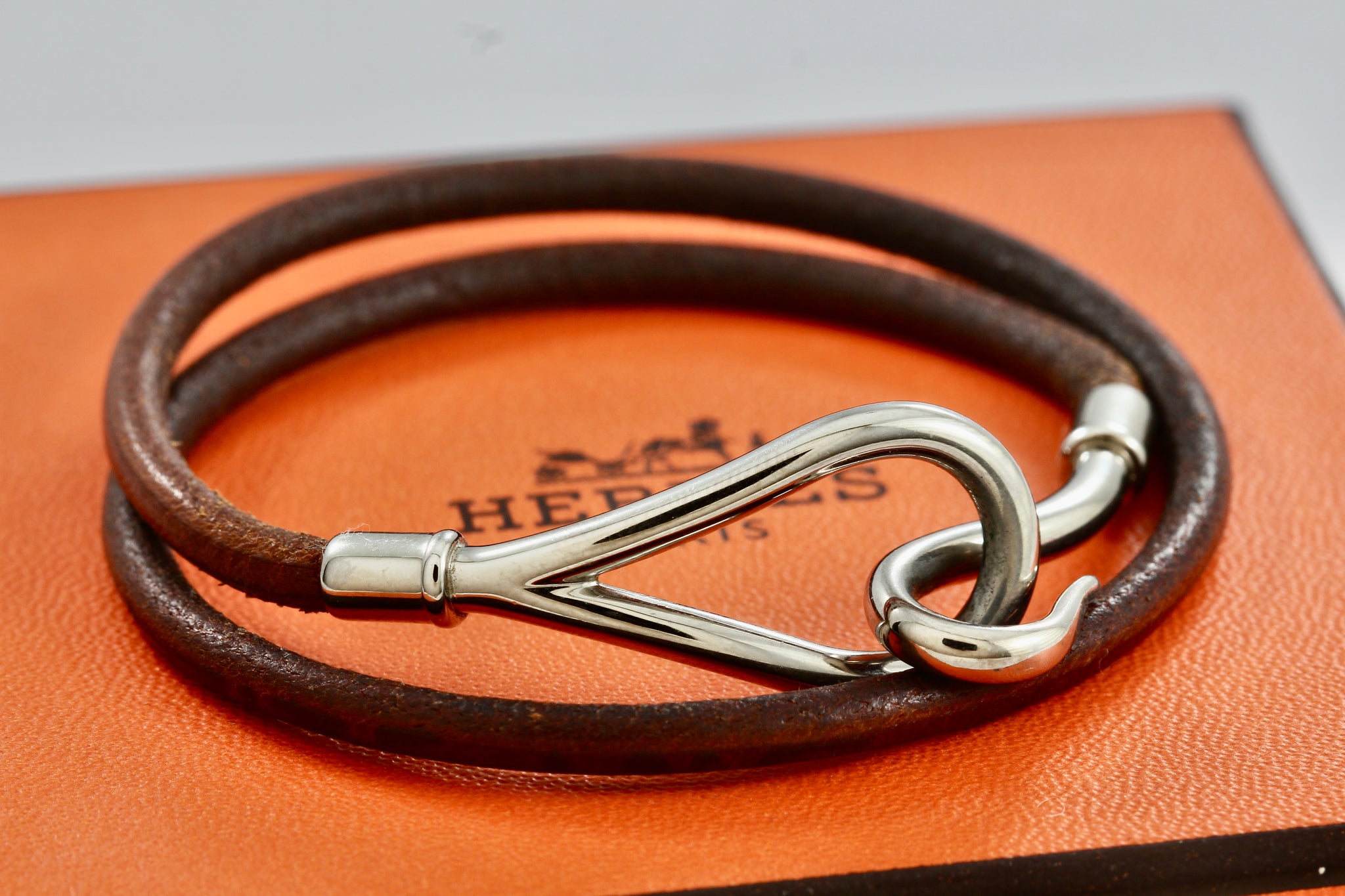 HERMES Silver tone Jumbo Hook Brown Leather Necklace Double Bracelet Authentic