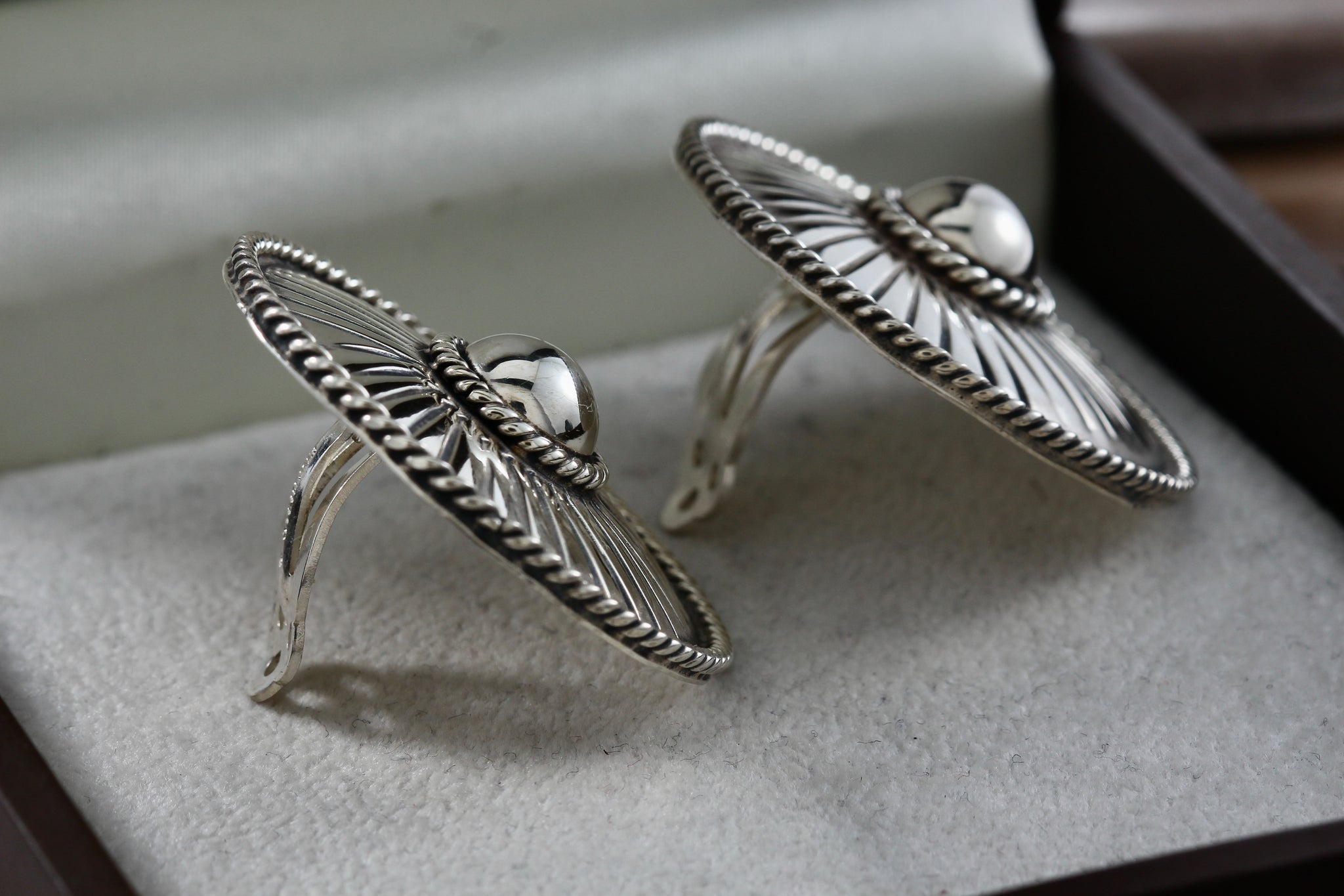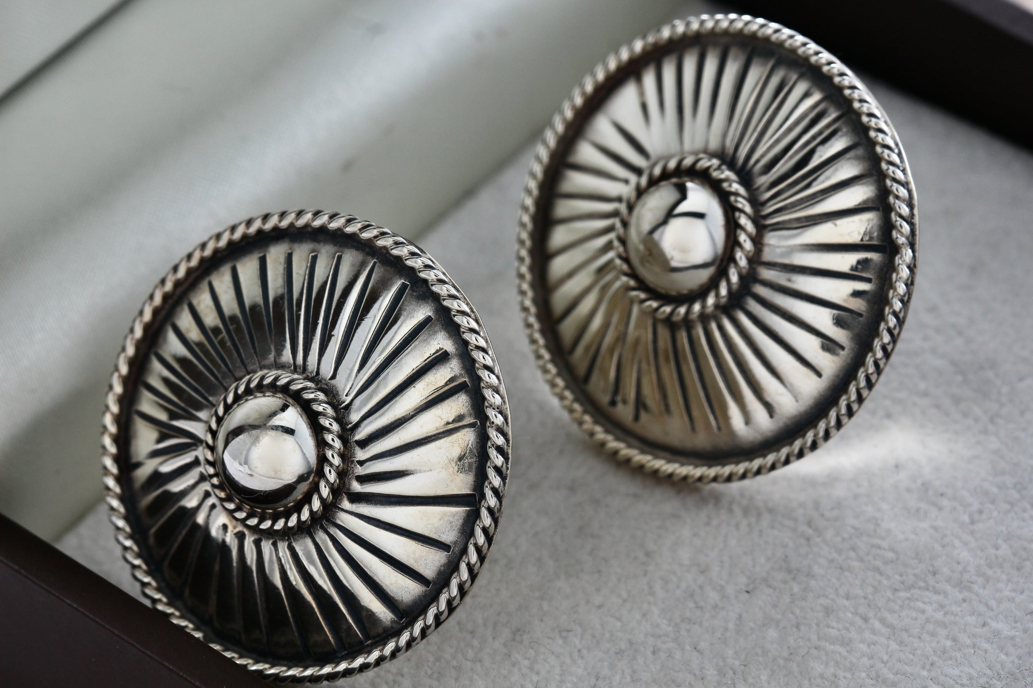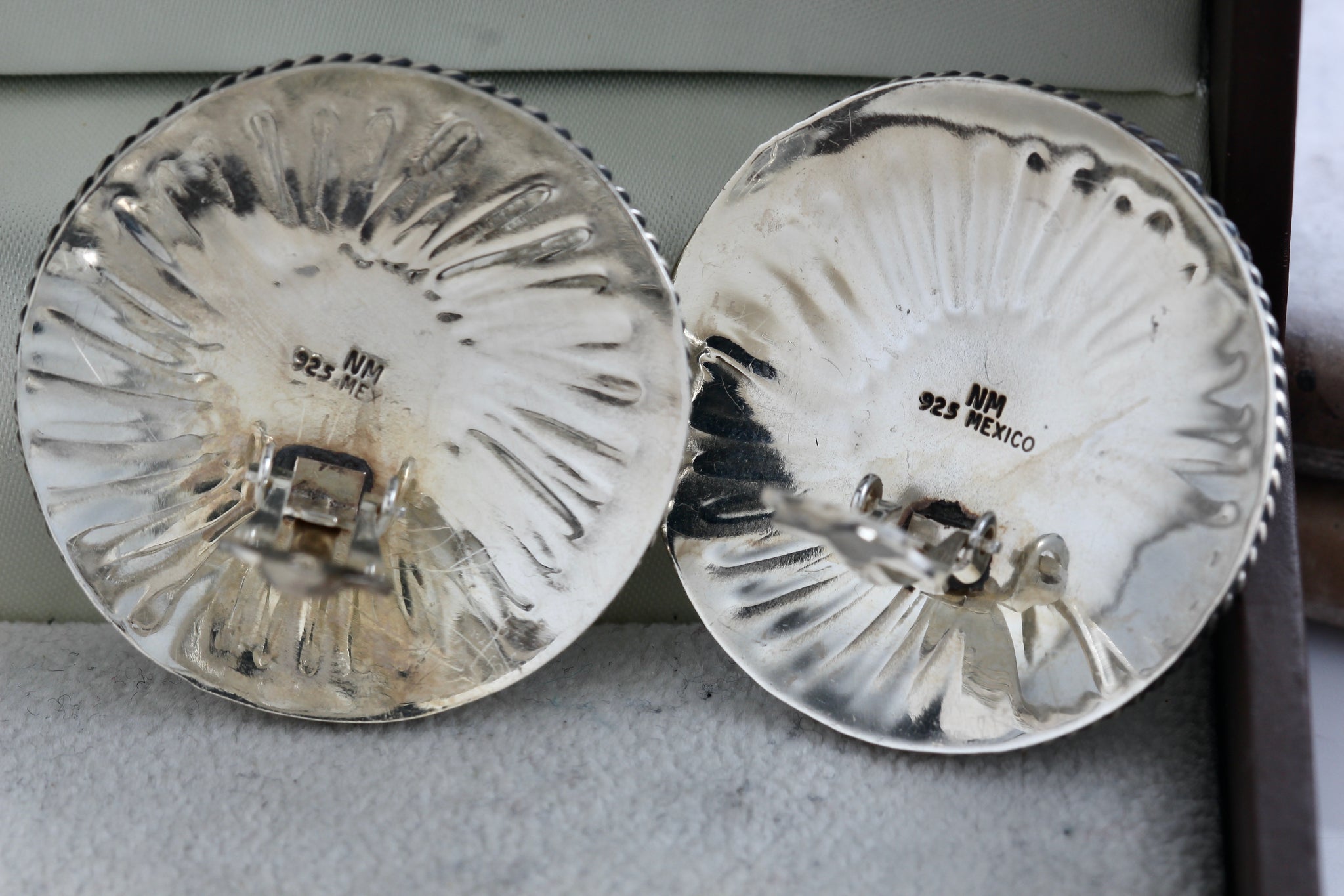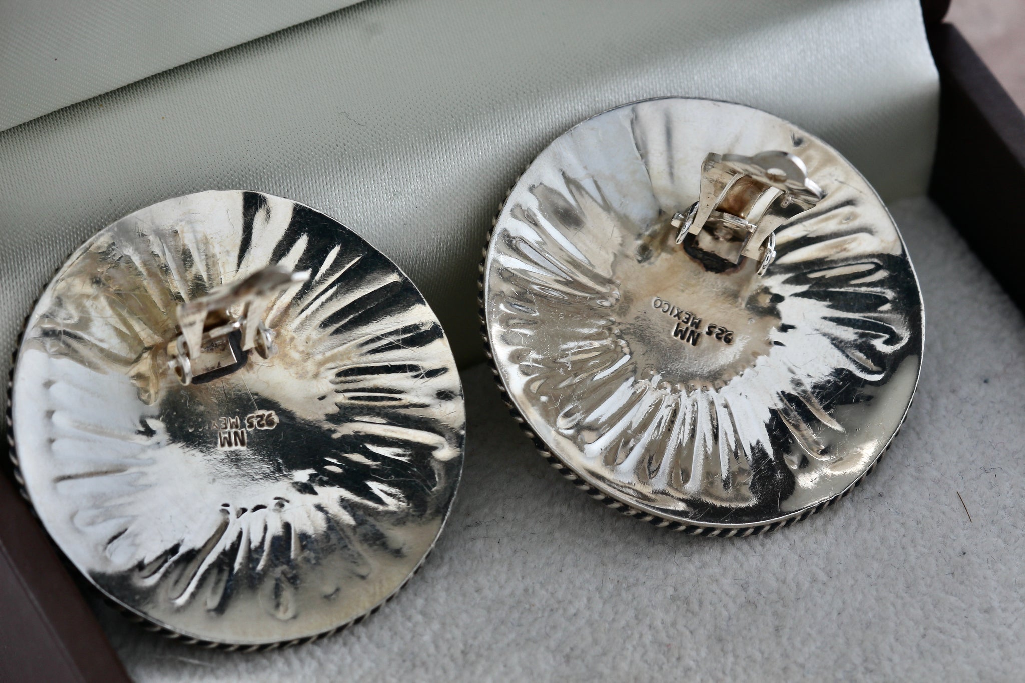 NM Large Mexico Sterling Silver Twist Rope Edge Round Circle Clip-On Earrings