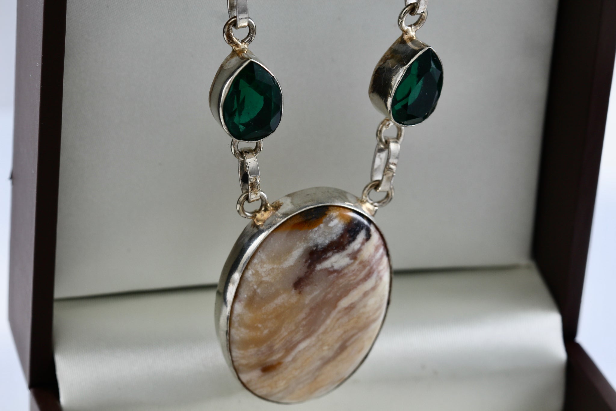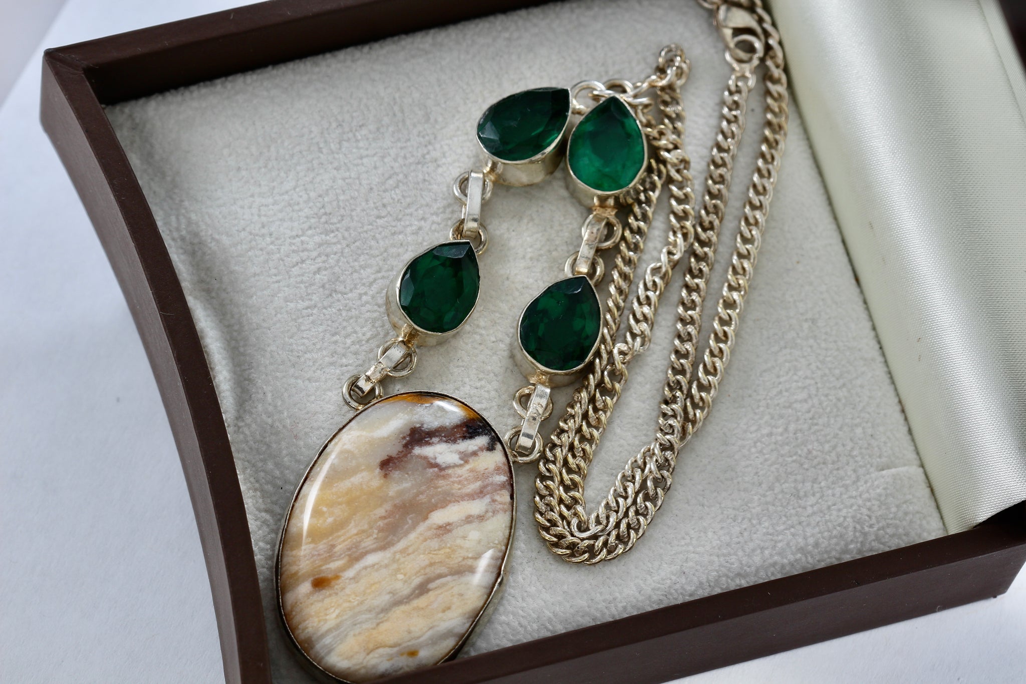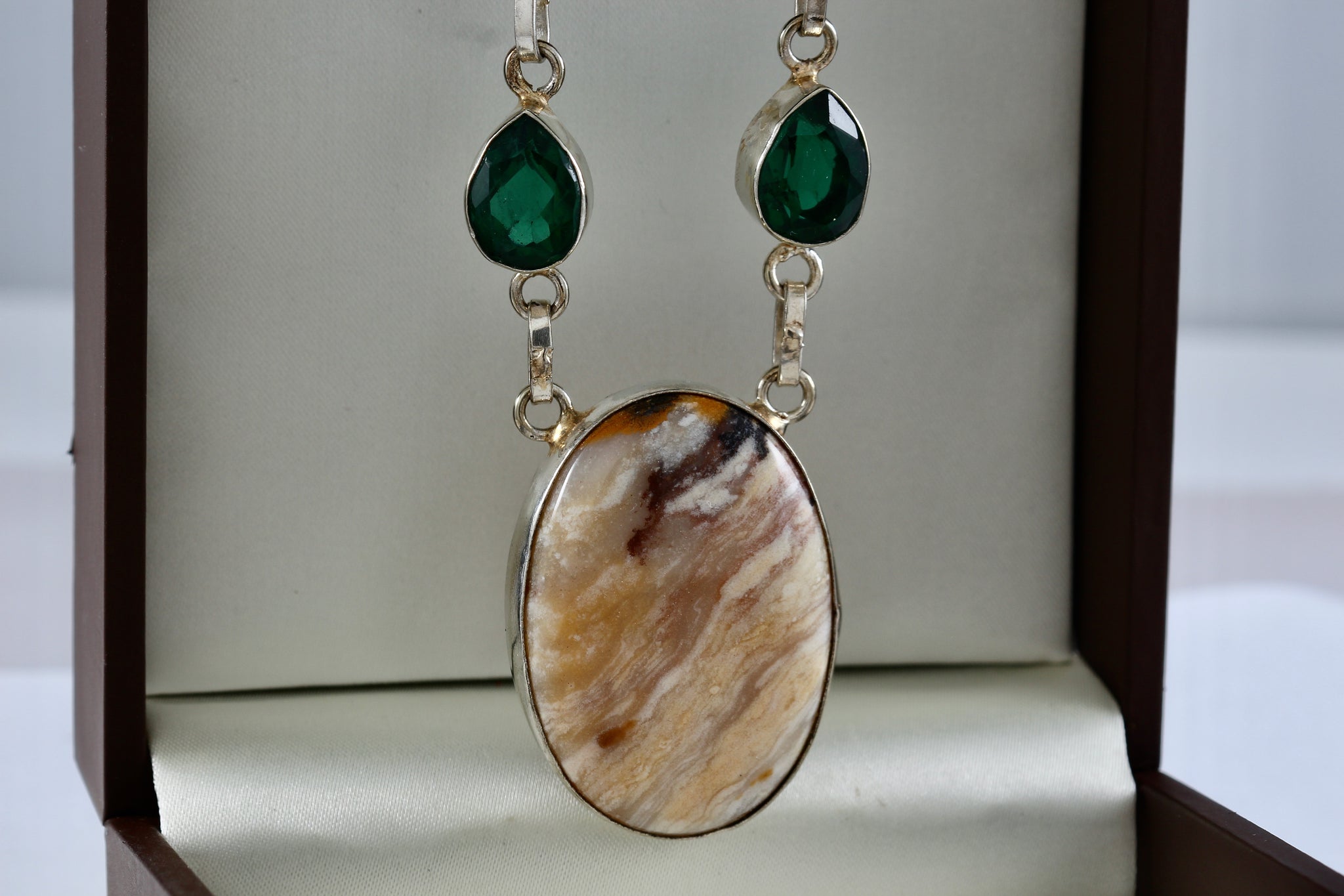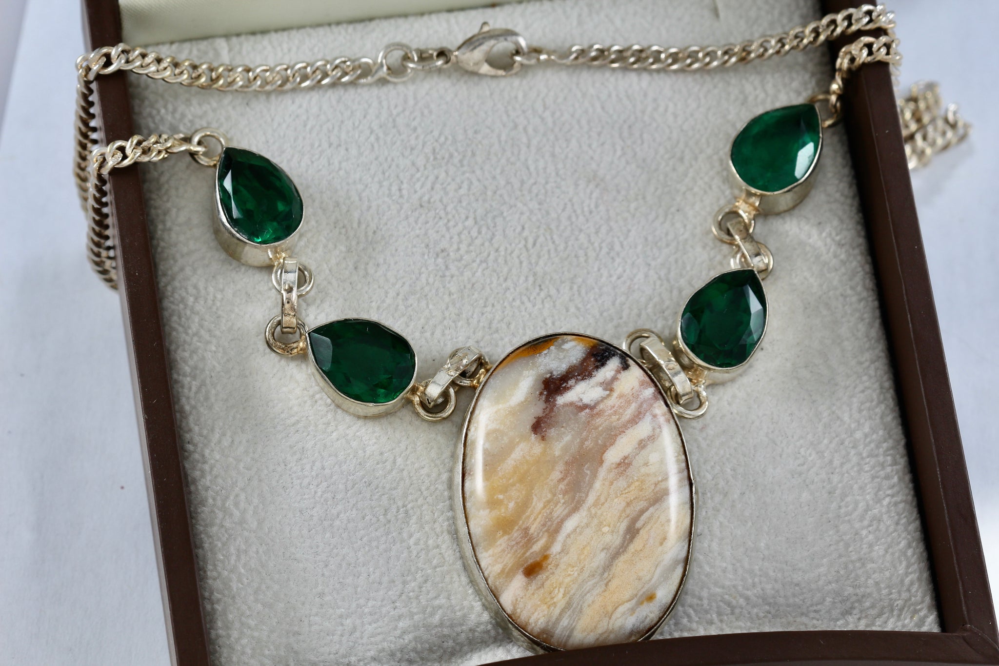 Silver Handmade Large Oval Chalcedony Agate Stone & Green Emeralds Necklace
