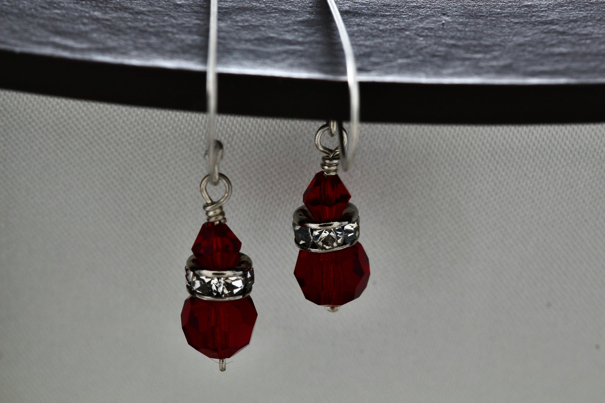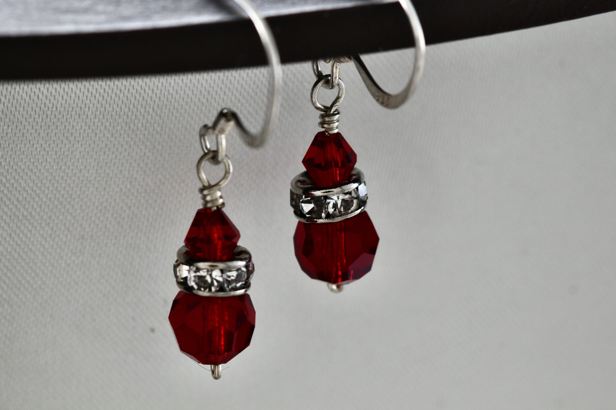 Sterling Silver CZ Diamonds Red Glass Beads Dangle Hook Earrings