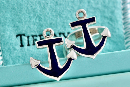 Tiffany & Co. Mens Silver Blue Enamel Anchor Cufflinks Vintage
