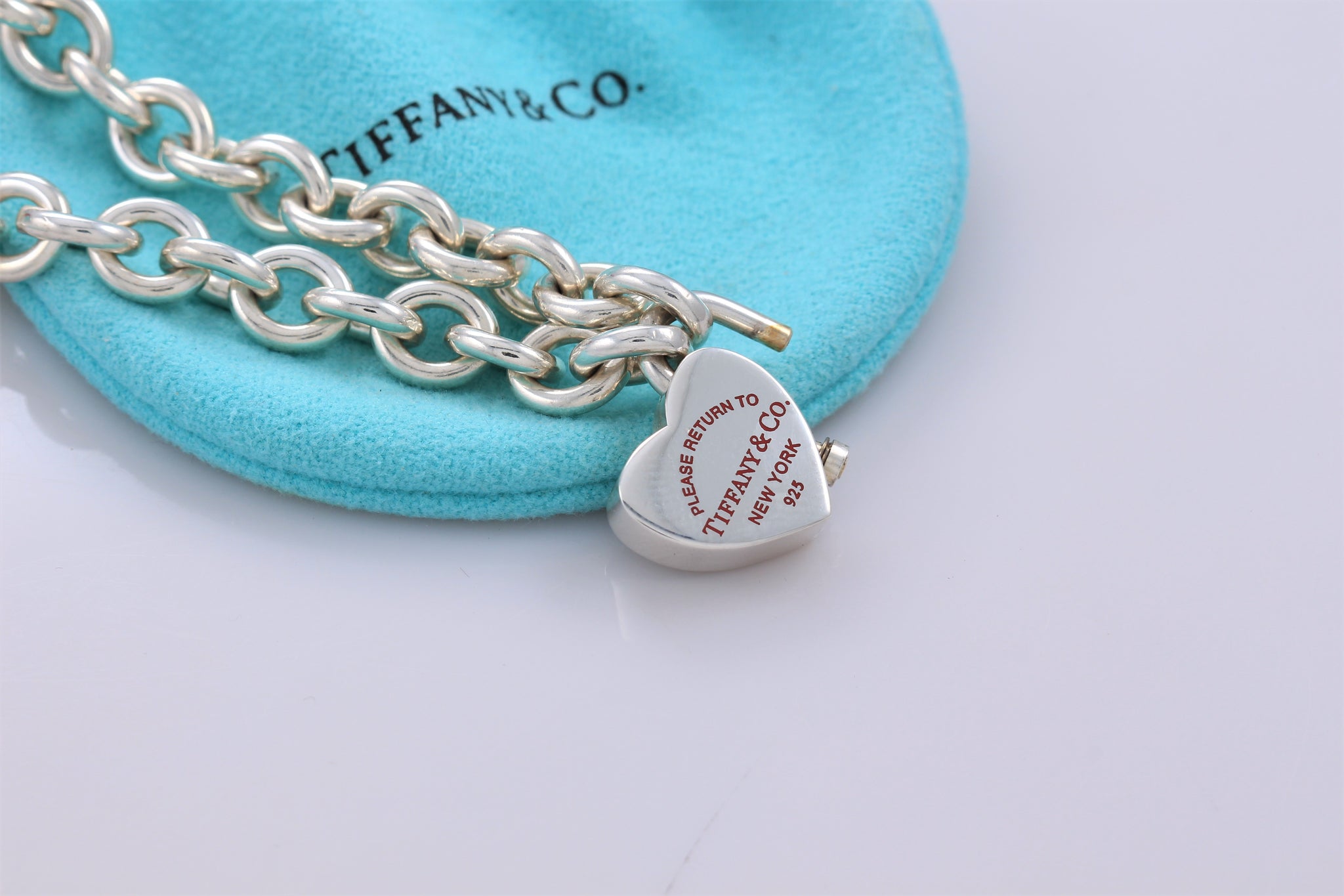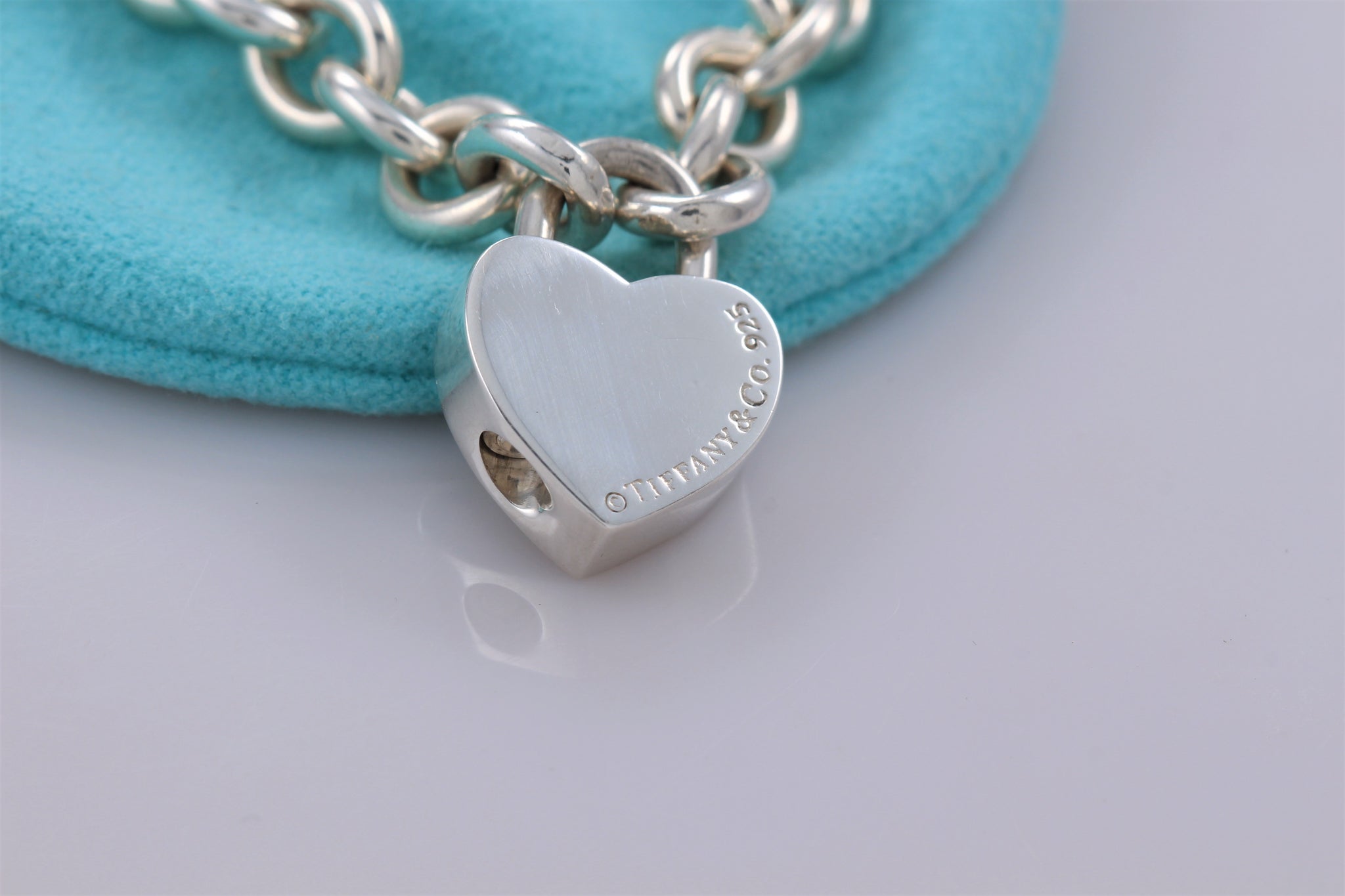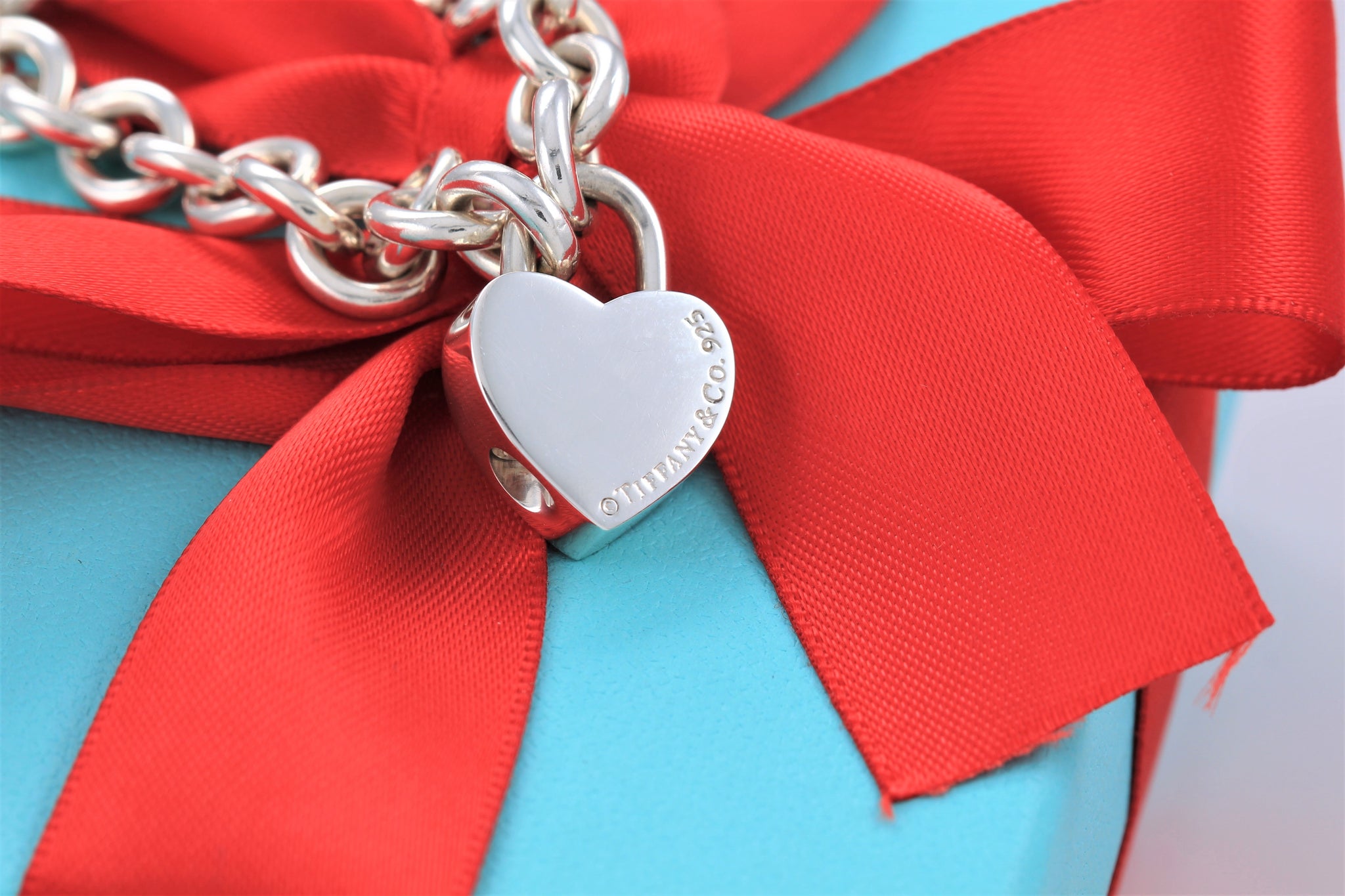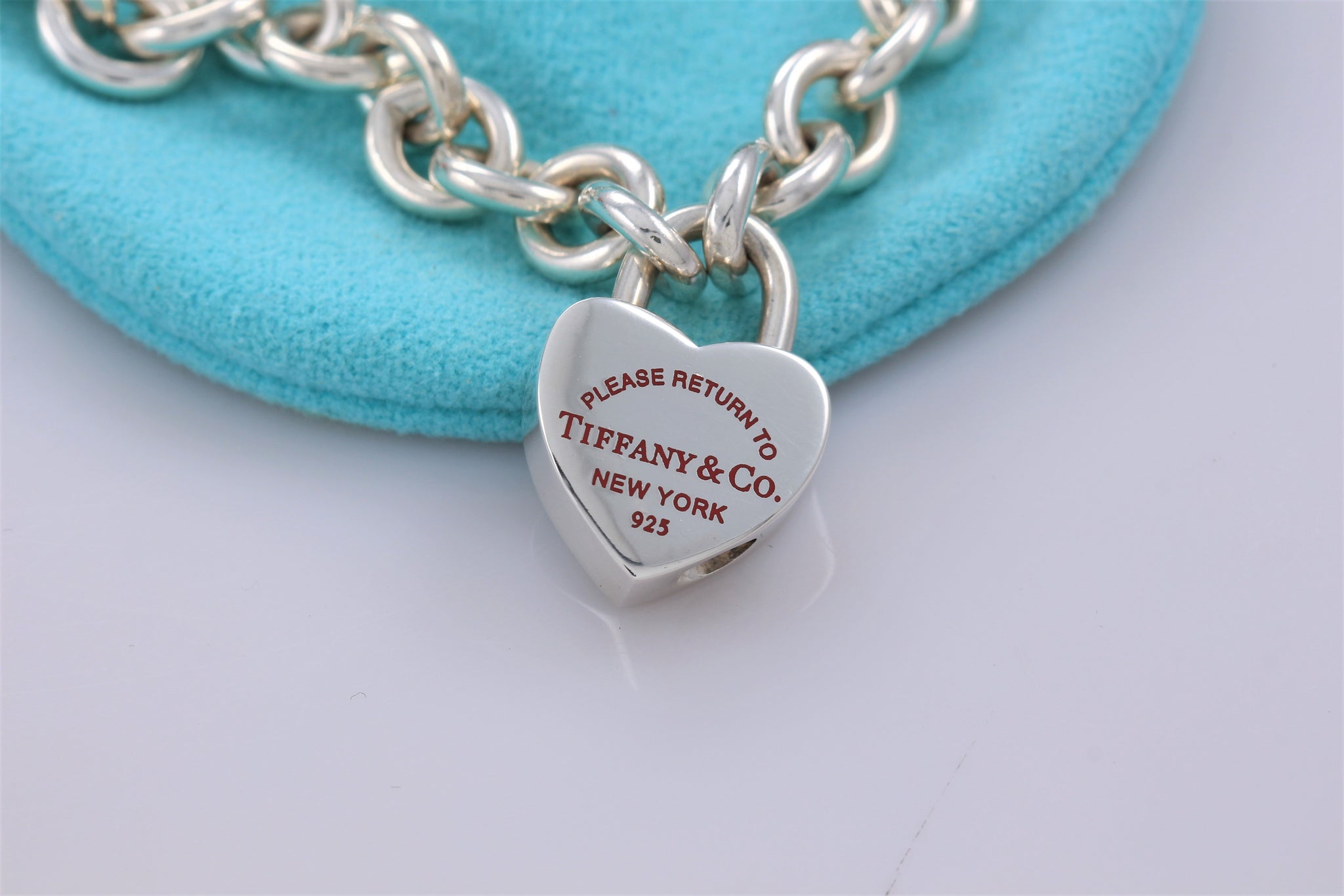 Return To Tiffany & Co. Silver Red Enamel Lettering Heart Padlock 7.5" Bracelet