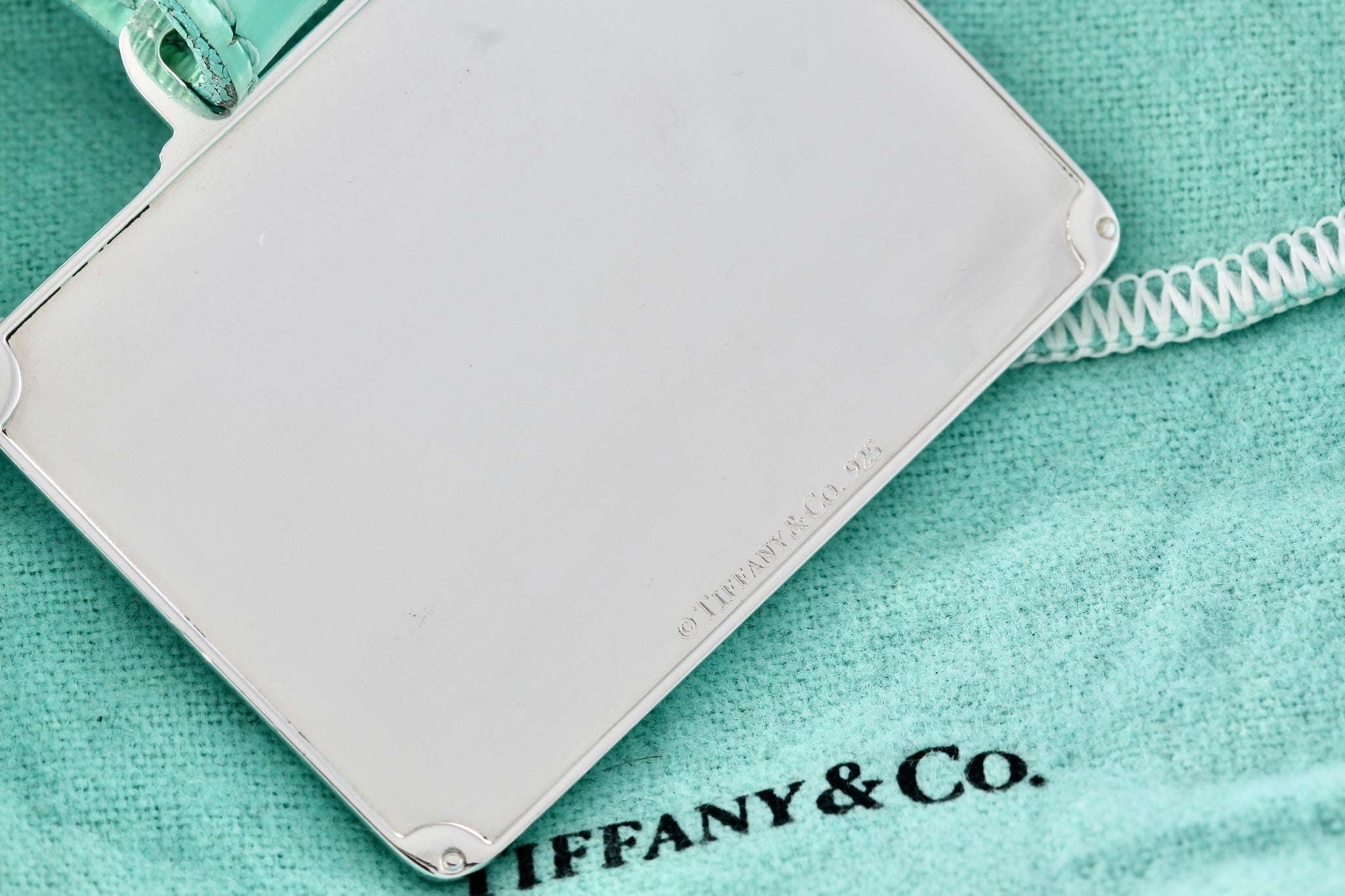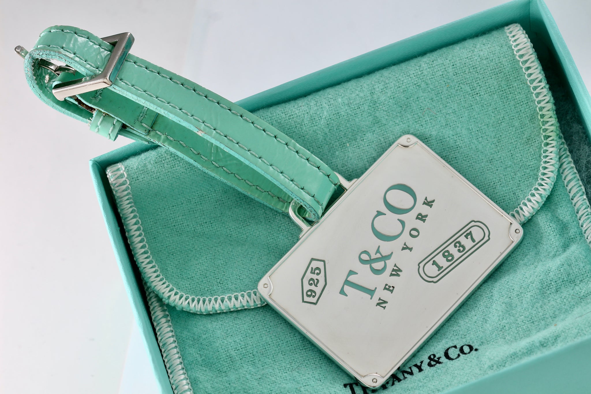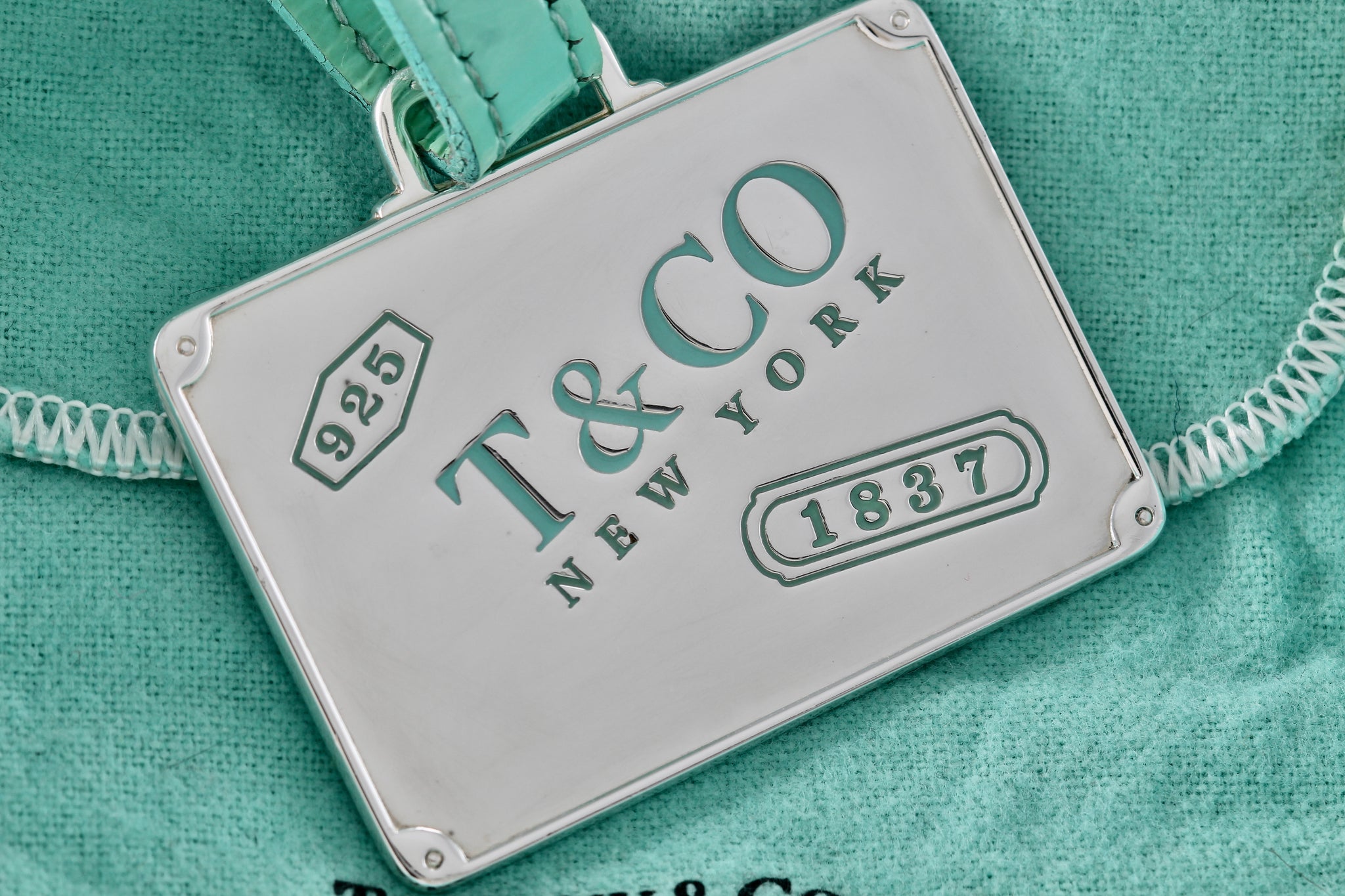 Tiffany & Co. 1837 Silver Blue Enamel Lettering Large Rectangle Leather Strap Luggage Tag