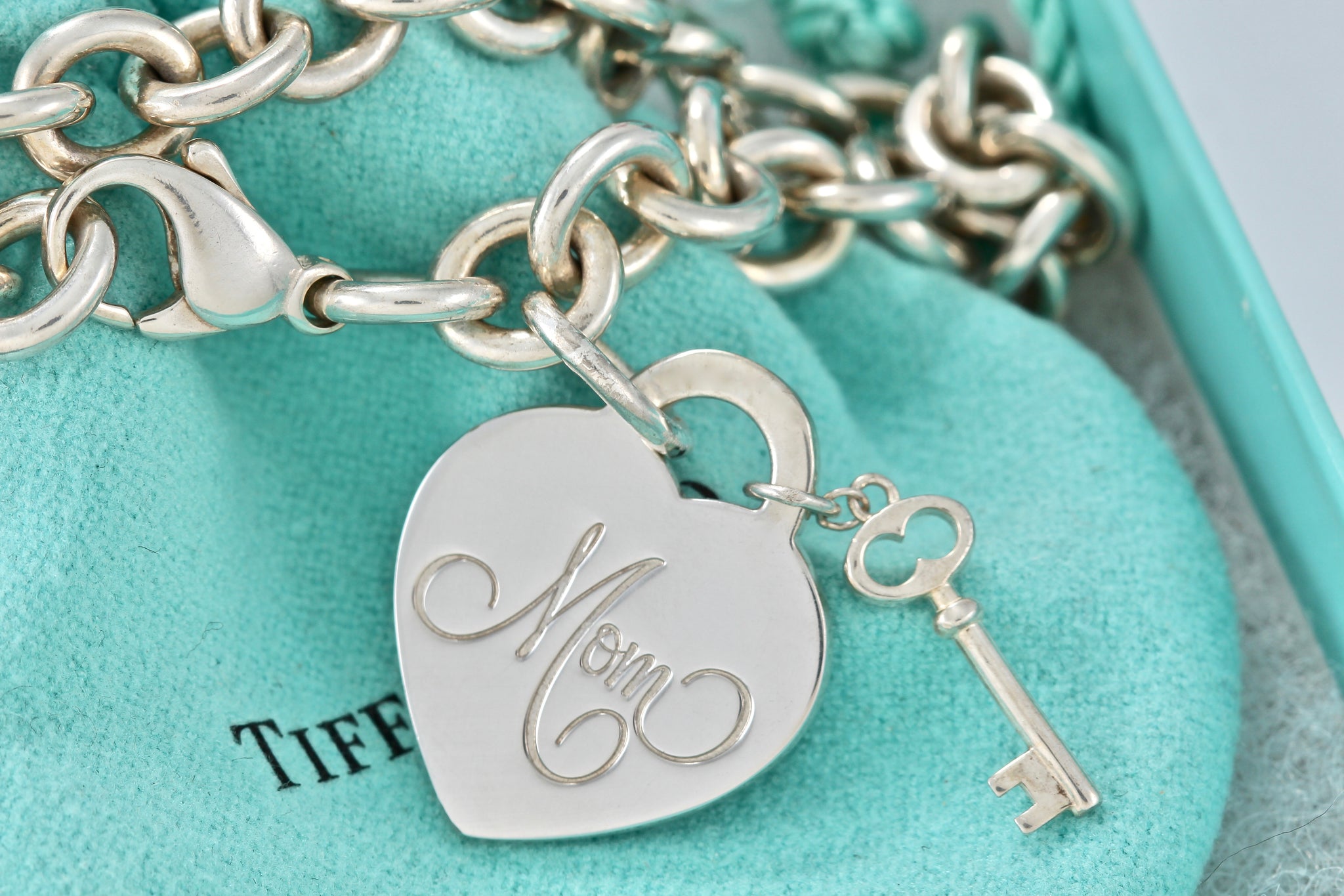 Tiffany & Co. Silver "MOM" inscribed Heart & Mini Key Charm Bracelet